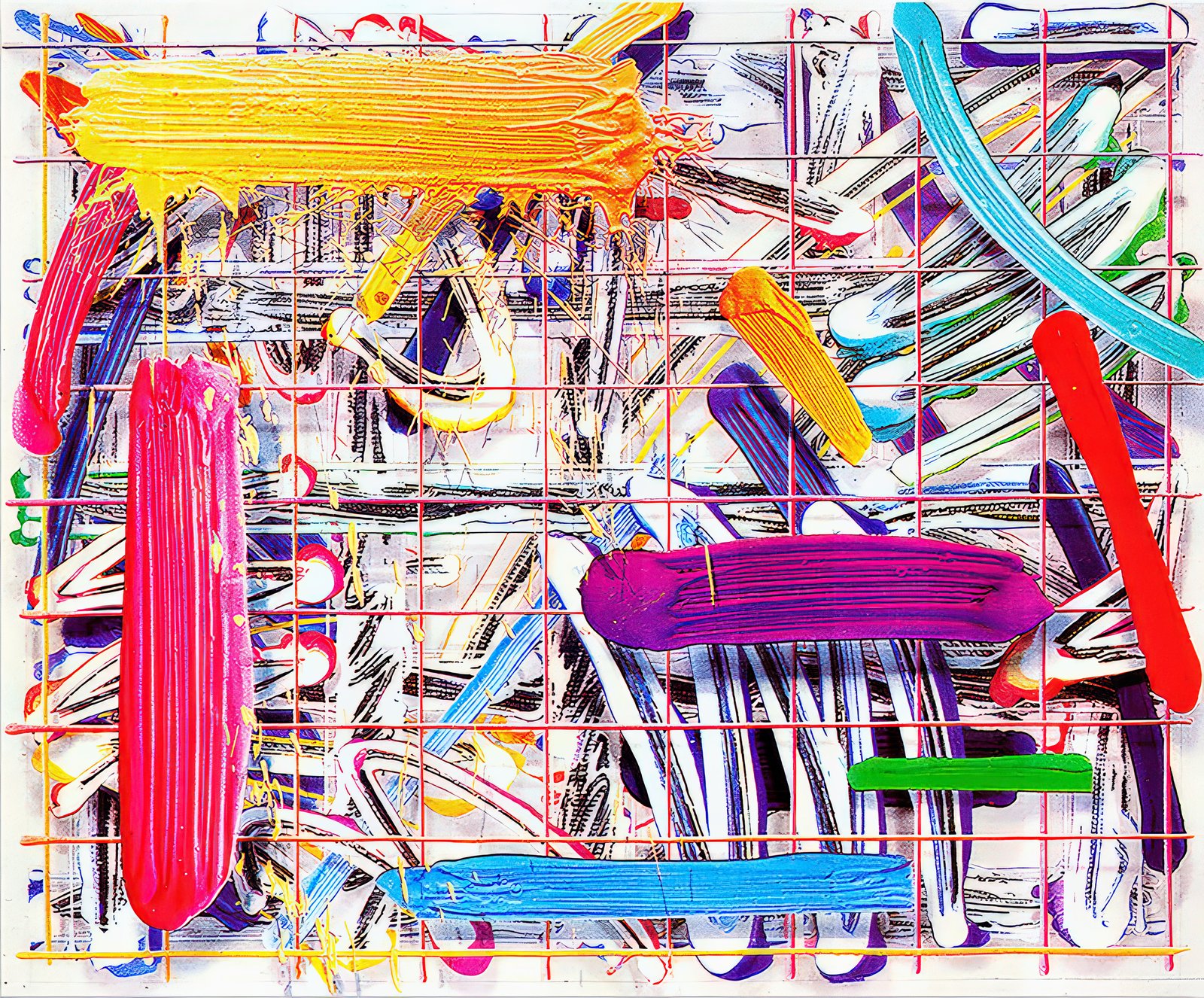 "The formal tension between control and abandon is generated both laterally, across the paintings' surface, and inwardly, from one receding level to the next. The brash, saturated strokes are anchored by deeply rooted grids and framing devices... the brushstrokes, which in abstract painting are so fundamentally bound to the picture plane, hover here unfettered."